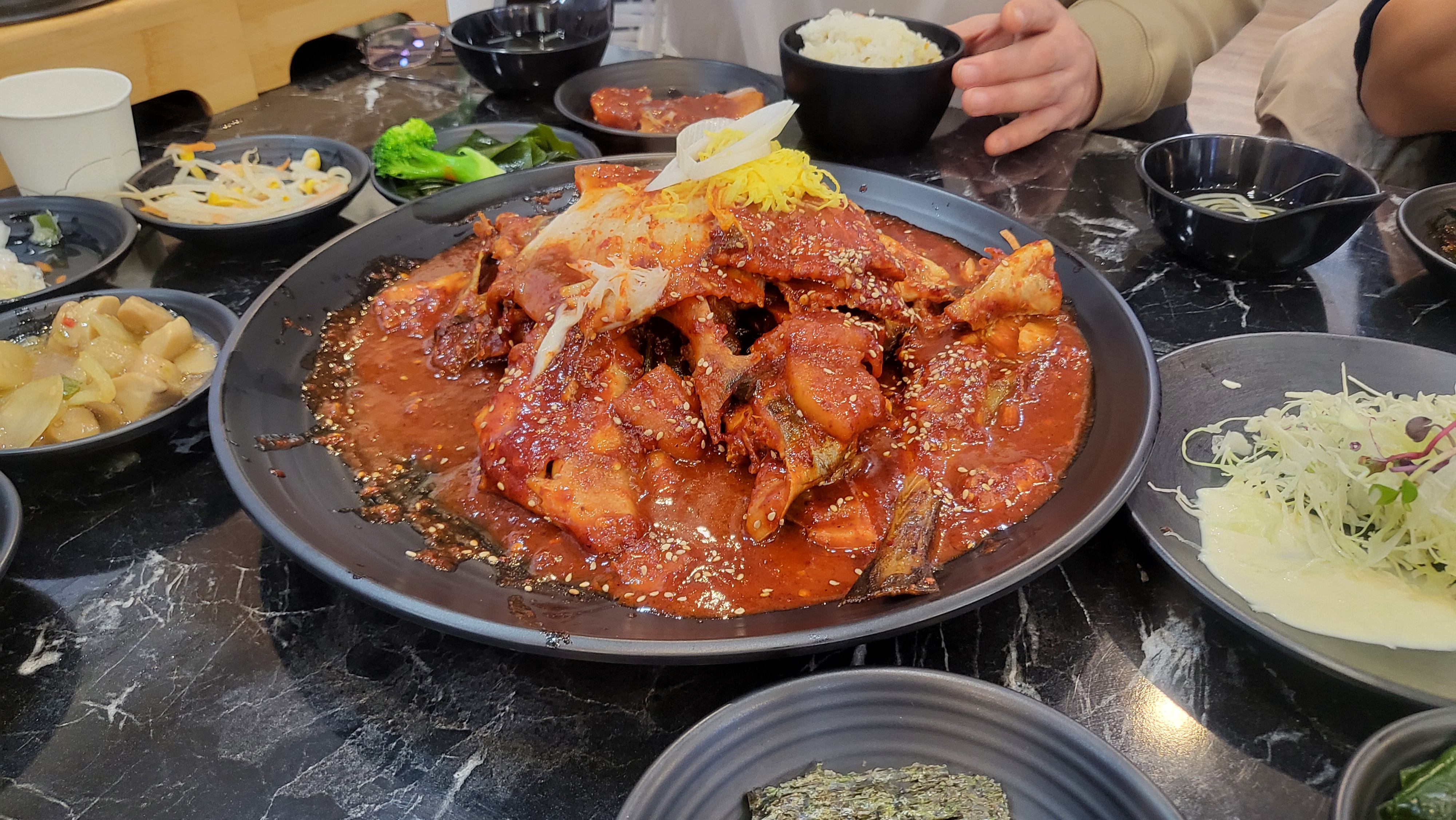 전체적으로 양도 넉넉하고 모둠찜 한 냄비에 생선 종류가 다양해 식탁이 심심할 틈이 없었어요.