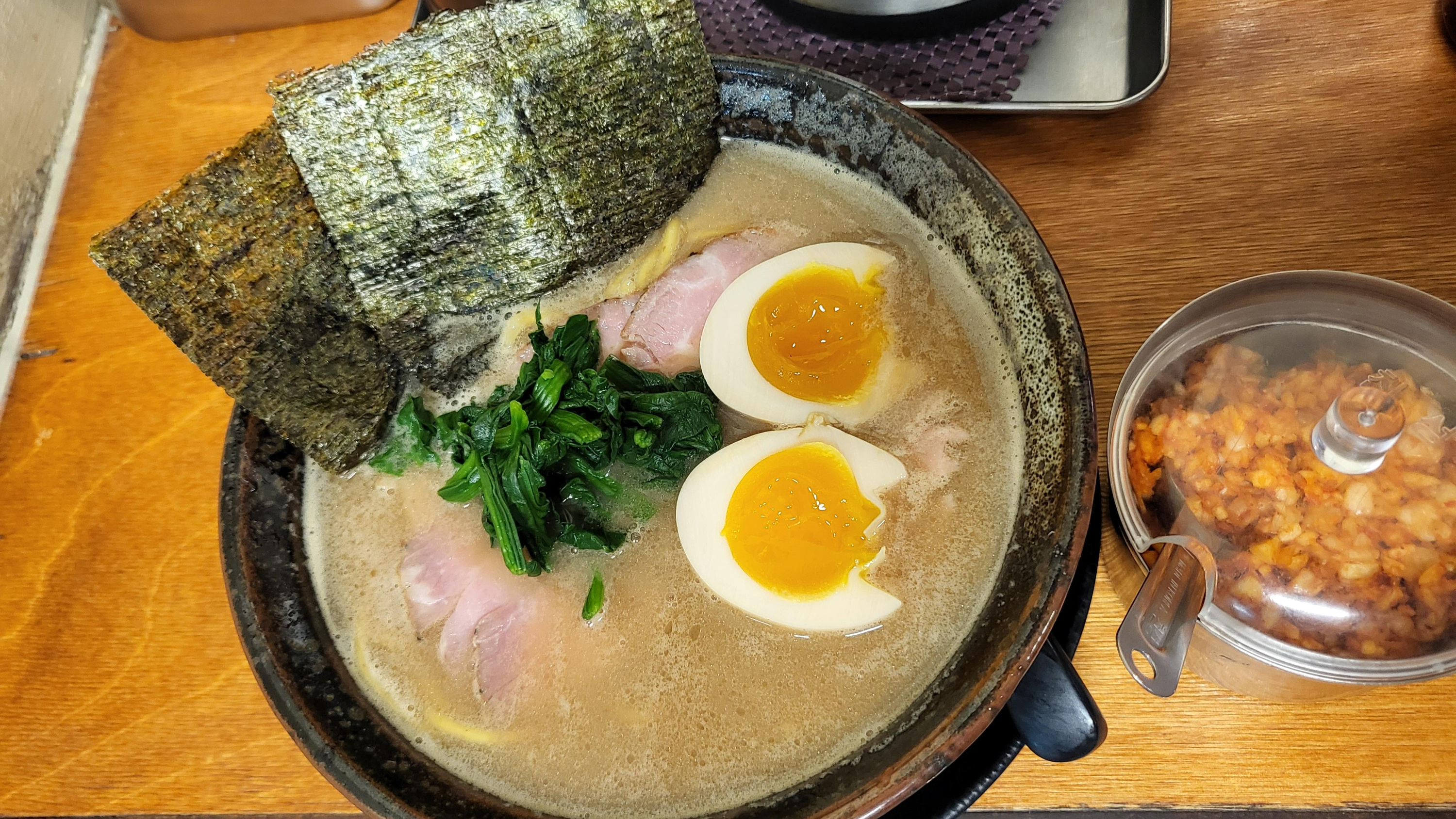 돈코츠 이에케 라멘은 좀 더 익숙한 진한 사골 베이스에 간장 향이 살짝 올라오는 스타일이라 지로케라멘보다 덜 헤비 하게 느껴졌어요.