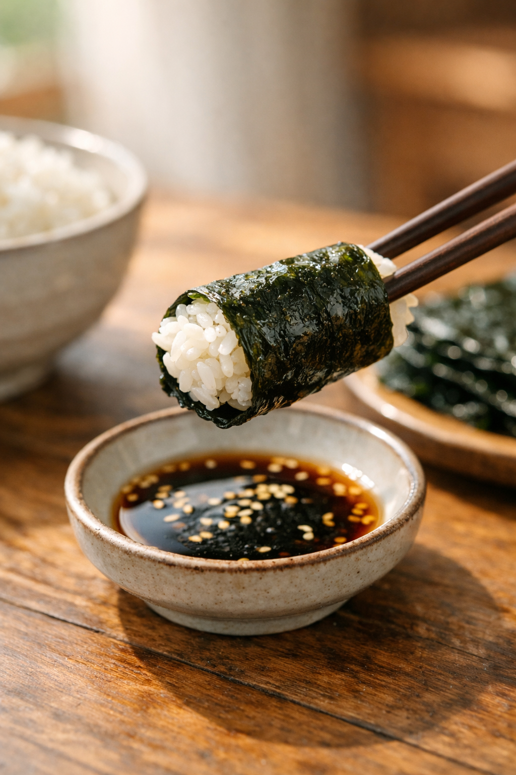 간장 : 참기름 = 2 : 1 비율로 섞으면 감태김의 풍미를 해치지 않으면서 맛있게 즐길 수 있습니다.
