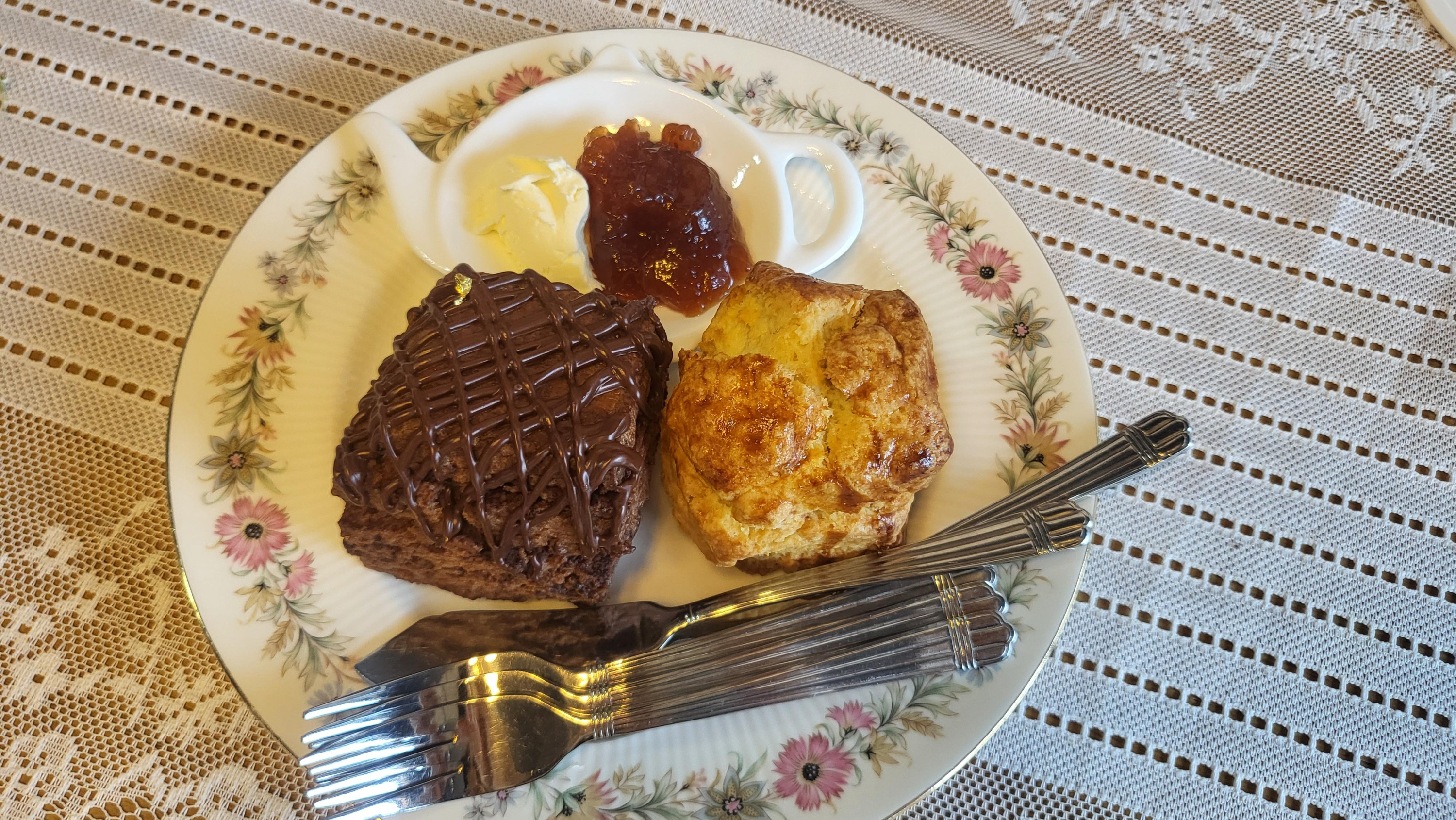 굽기가 알맞아 바삭 겉면과 포슬한 결이 살아있고, 버터와 딸기잼이 따로 제공돼 클래식 조합을 즐길 수 있어요.