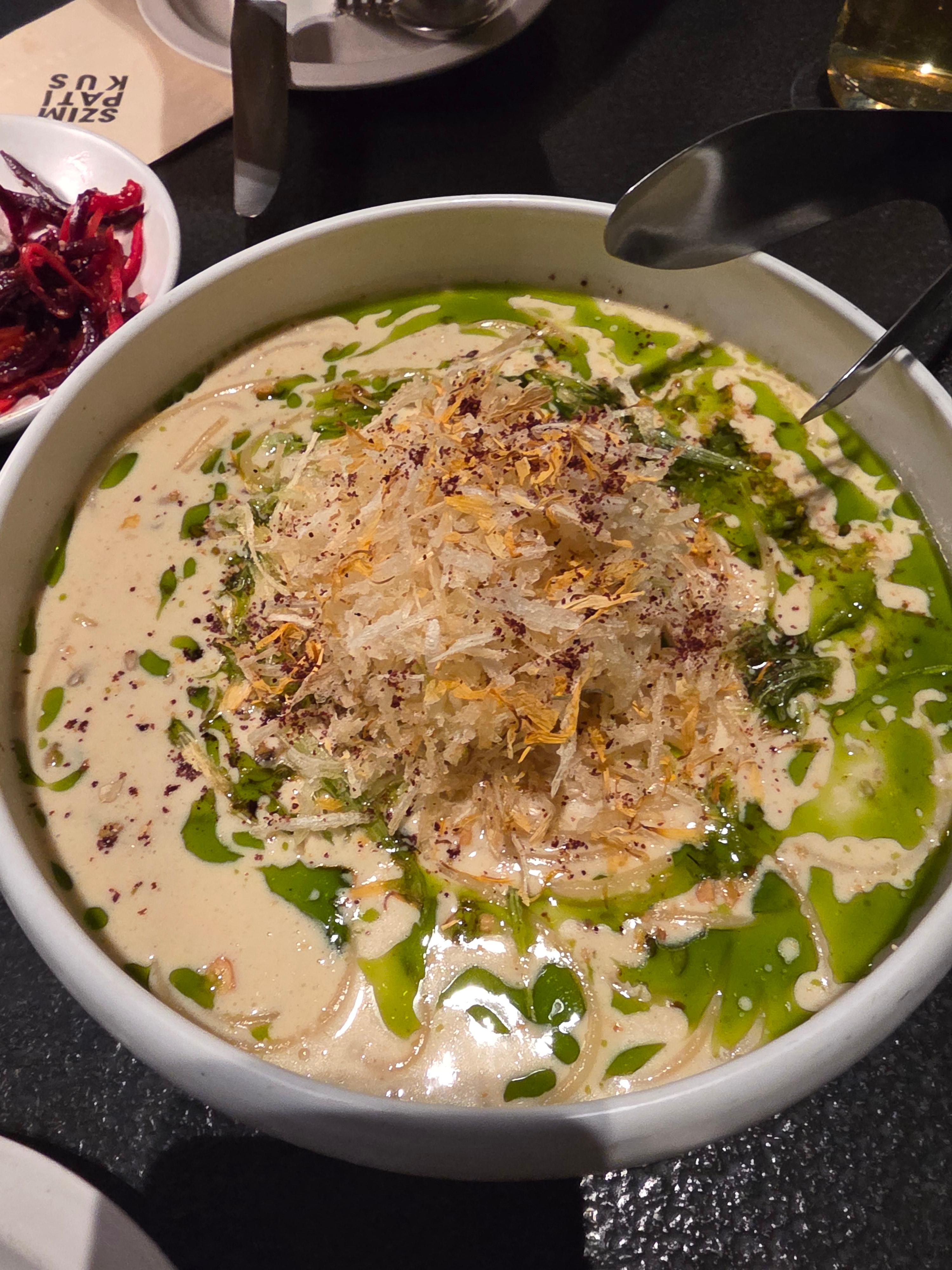 고추오일 명란크림 파스타는 명란의 짭짤함과 크림의 부드러움에 매콤한 고추오일이 깔아줘서 계속 손이 갔고, 파채 튀김이 식감을 살려줬어요.